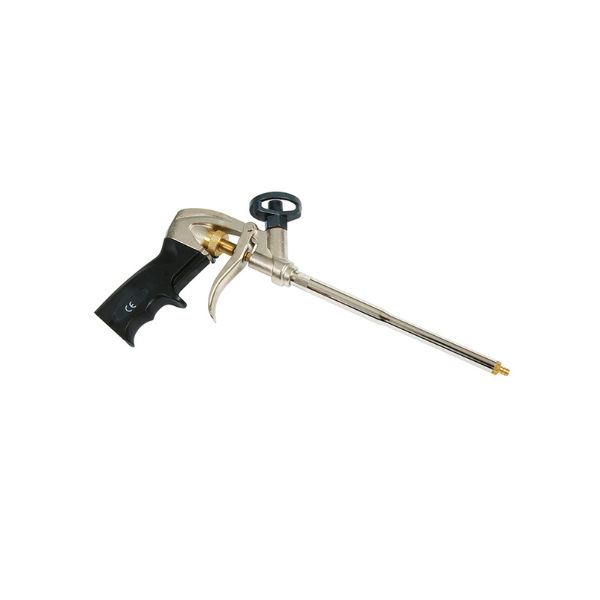 Professional tradesman foam gun with above handle flow control allowing one handed use.