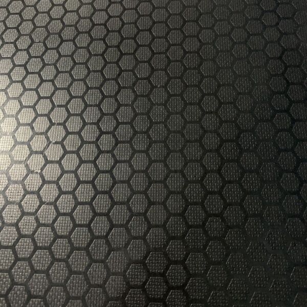 The surface layer is imprinted with a raised pattern consisting of hundreds of hexagonal raised areas of approximately 10mm diameter in a geometric configuration.